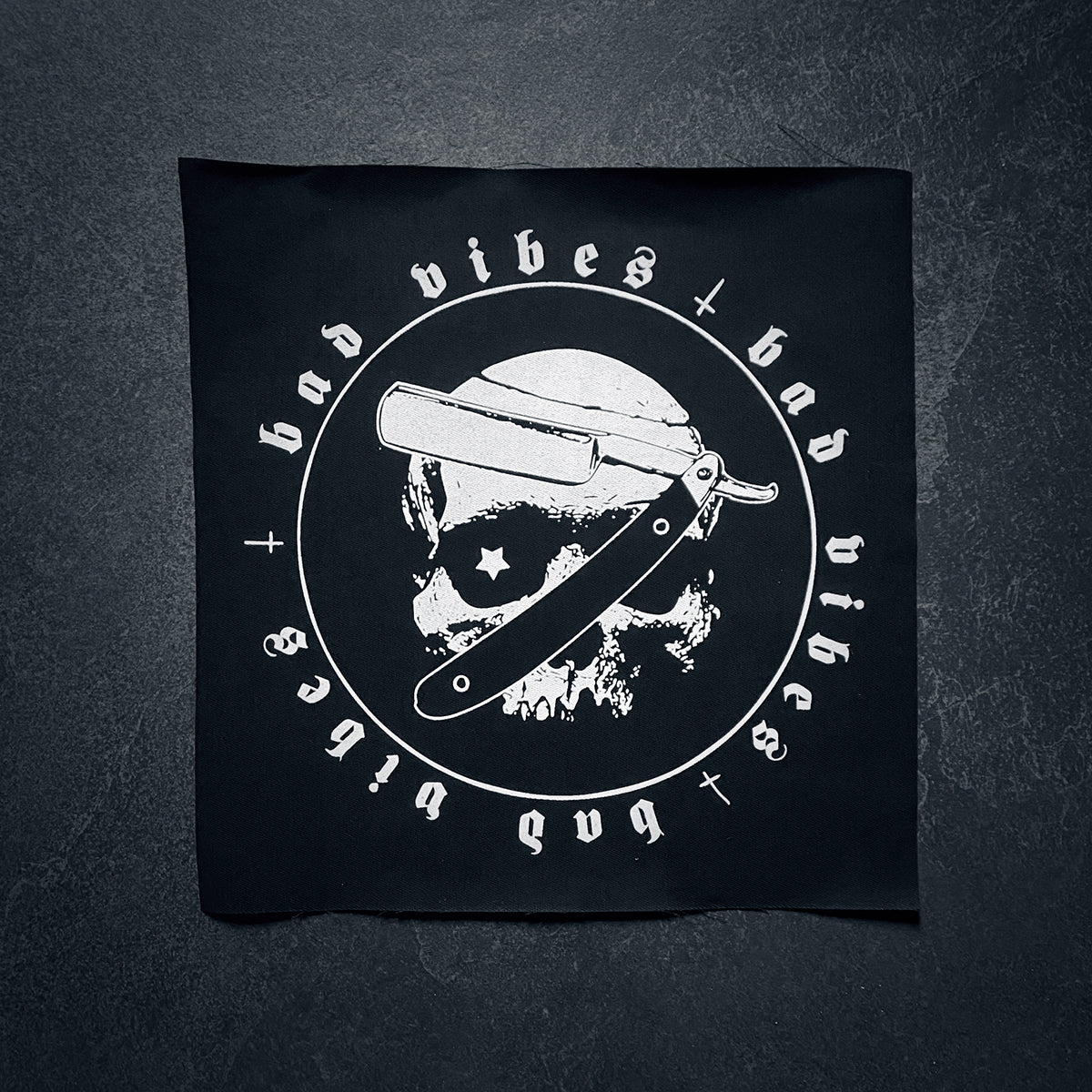 This is a screen printed patch on plain, black, heavy cotton fabric. Ink color is white. There is no iron on backing and the edge is raw-cut, there is no merrowed border. Size is approx 32 x 32 cm. Color is white.