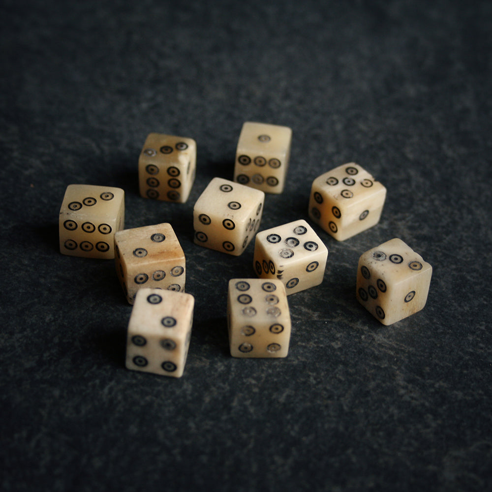 Handmade bone dice, 10 pcs/pack. based on archeolgical findings from Tuna in Badelunda, Viking age. Size approx. 10×10 mm.
