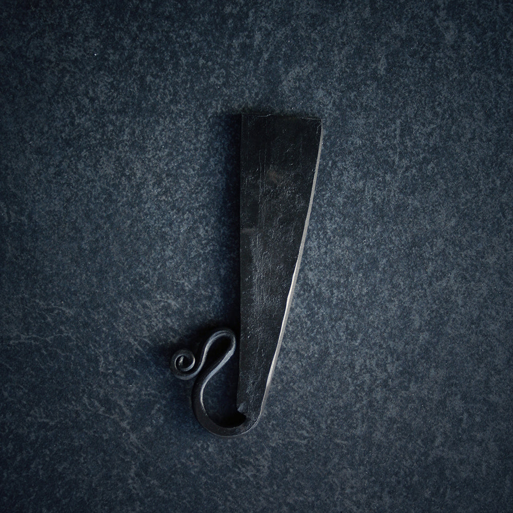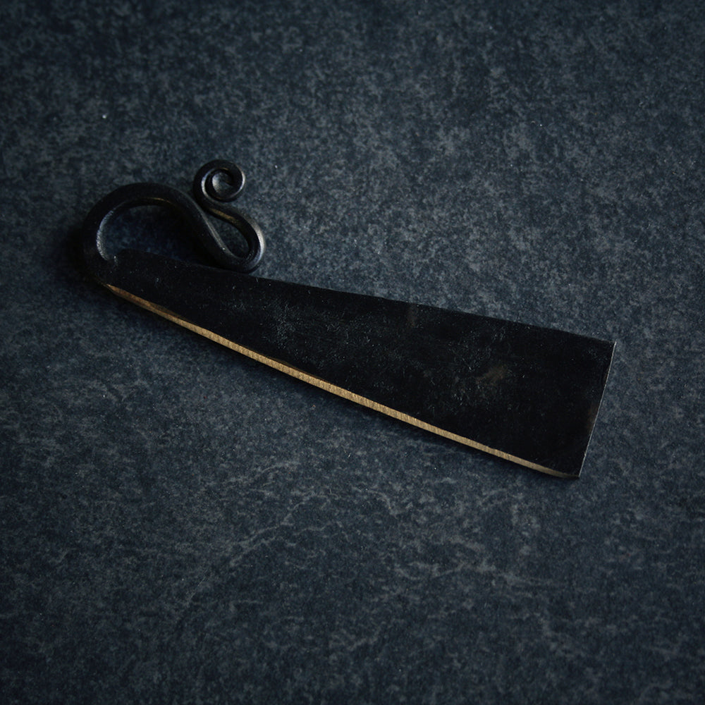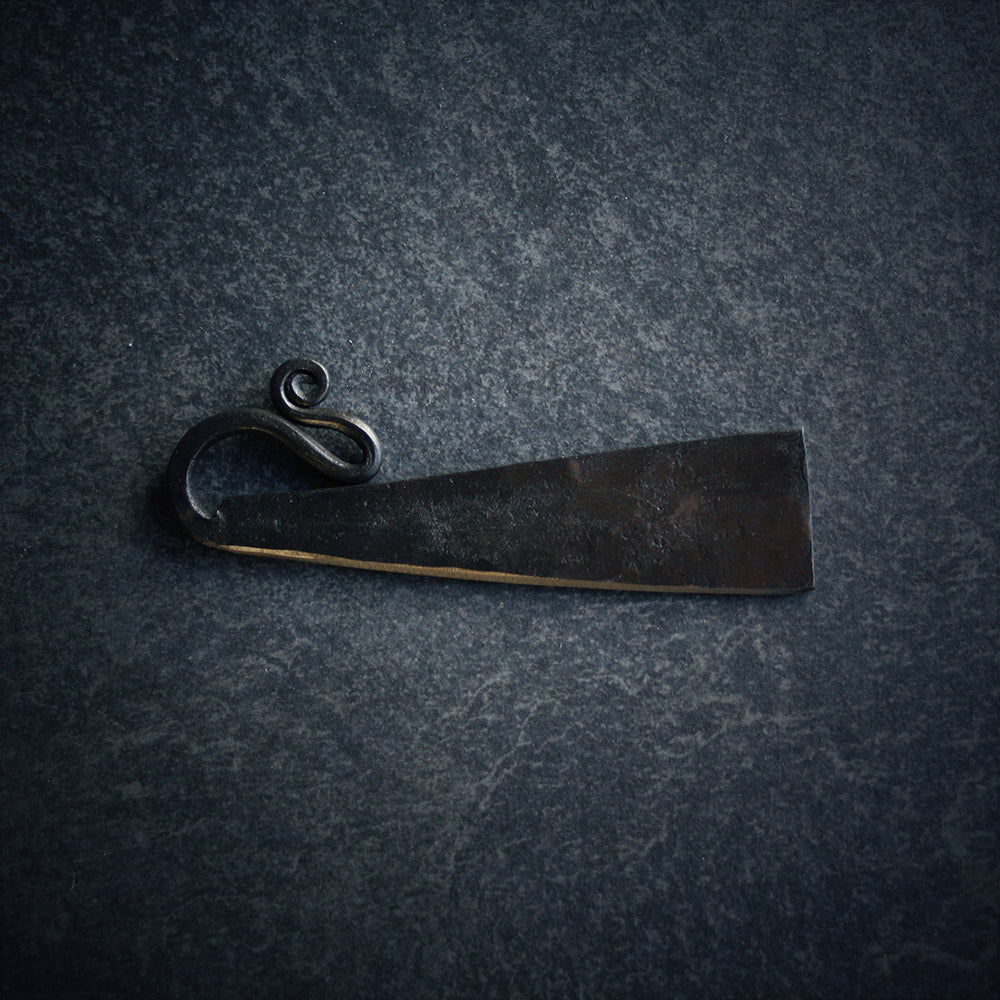 Hand-forged larger kitchen knife made of steel after a model from the bronze Ages. The knife has a length of approximately 11 cm.