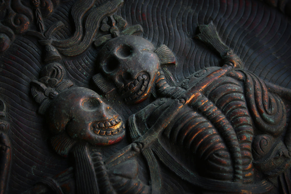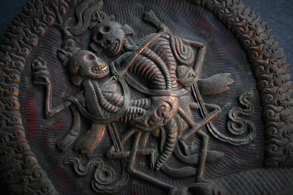 Citipati, Chitipati or Shmashana Adhipati is a protector deity or dharmapala in Tibetan Buddhism and Vajrayana Buddhism of the Himalayas. It is formed of two skeletal deities, one male and the other female, both dancing wildly with their limbs intertwined inside a halo of flames representing change. The Citipati is said to be one of the 75 forms of Mahakala. Their symbol is meant to represent both the eternal dance of death as well as perfect awareness. They are invoked as wrathful deities, benevolent protectors of fierce appearance. The dance of the Citipati is commemorated twice annually in Tibet