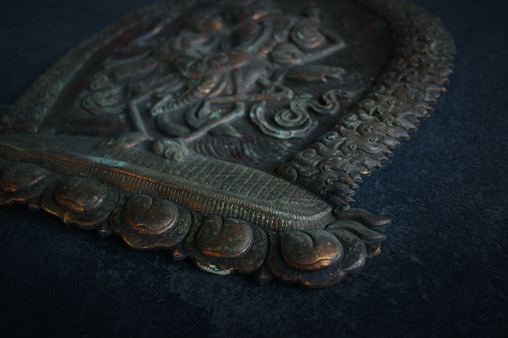 This is a highly unique and exclusive item. High quality metal large size plaque of intricate metal work by artisan craftsmen. Very unique and hard to find item. This goes perfect with your altar of focused work towards Citipati. This item is rather large and heavy.