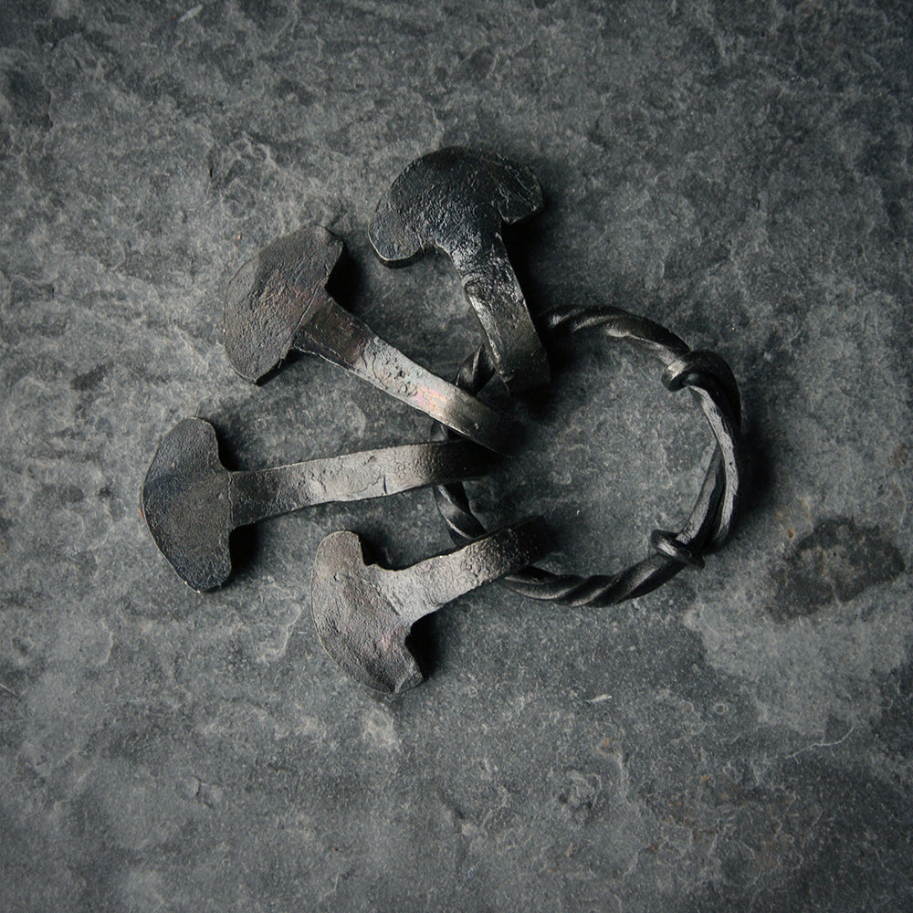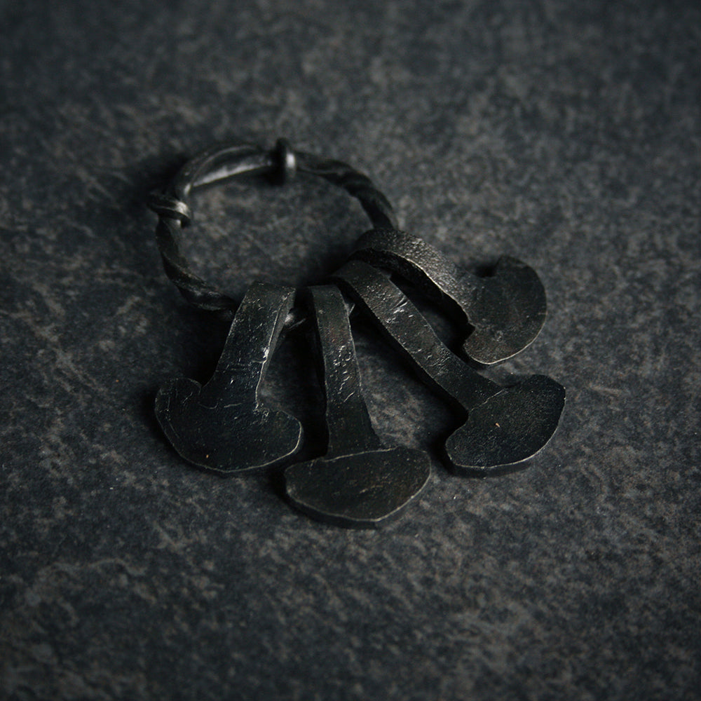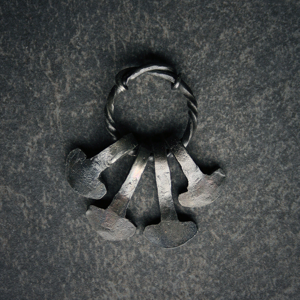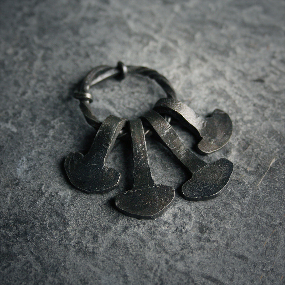 Pendant cluster with four iron hammers around a twisted ring. The pendant has a height of approx. 6 cm.
