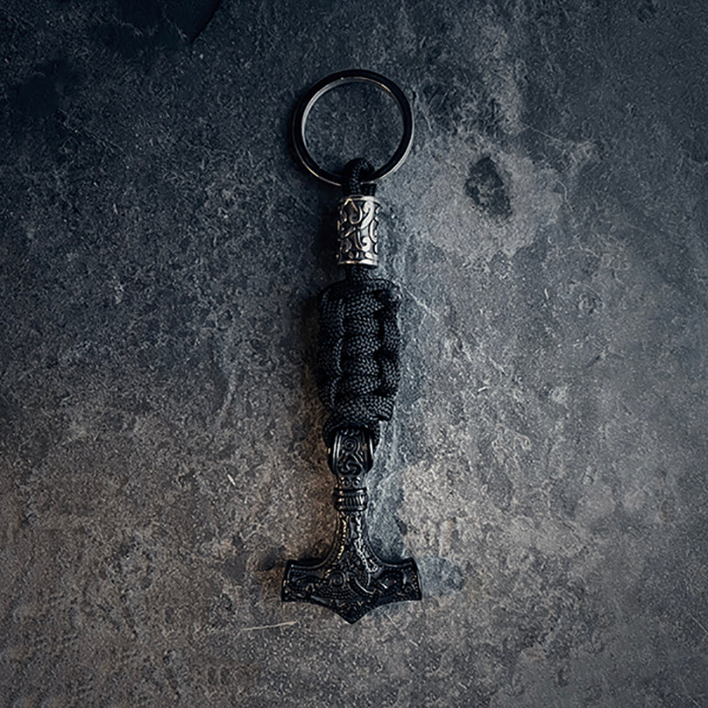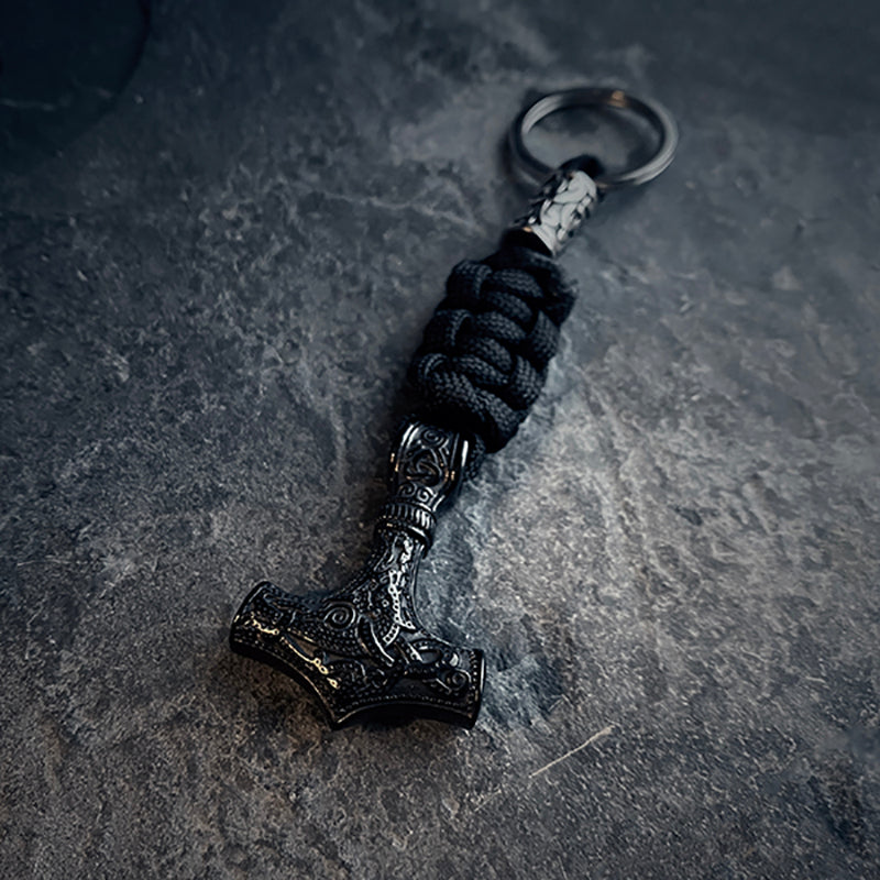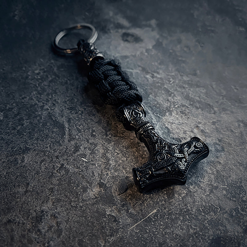 A jet black shiny Mjolnir in viking style keychain. Part of the specially curated collection with items, not designed by, but handpicked by Torvenius.