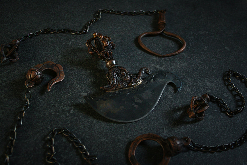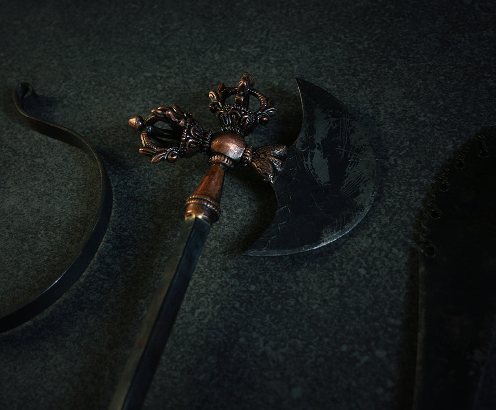 Buddhist ritual objects - ritual weapon tool set. This is a highly unique and exclusive item. This tool set consists of 15 item. Custom patina made for Torvenius store with dark aged look. This is a massive set.