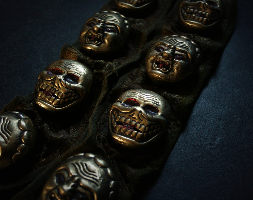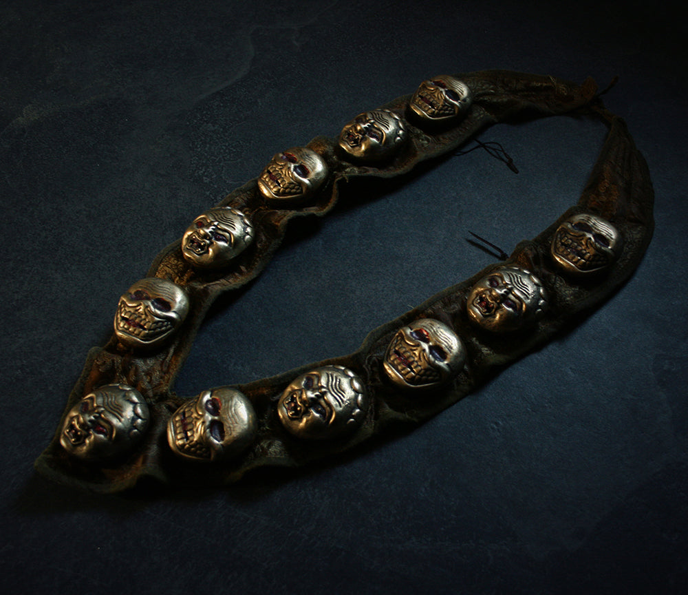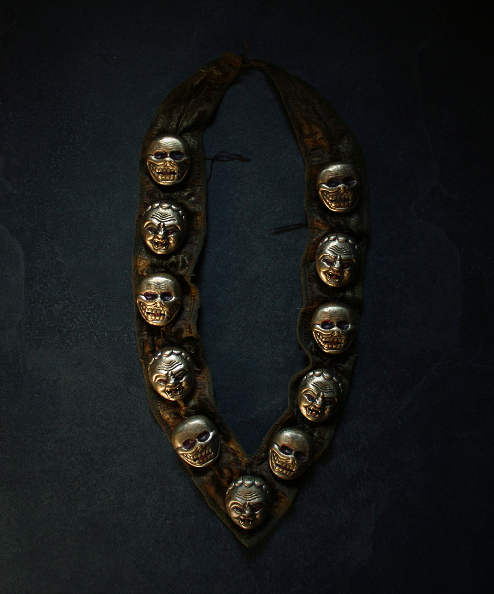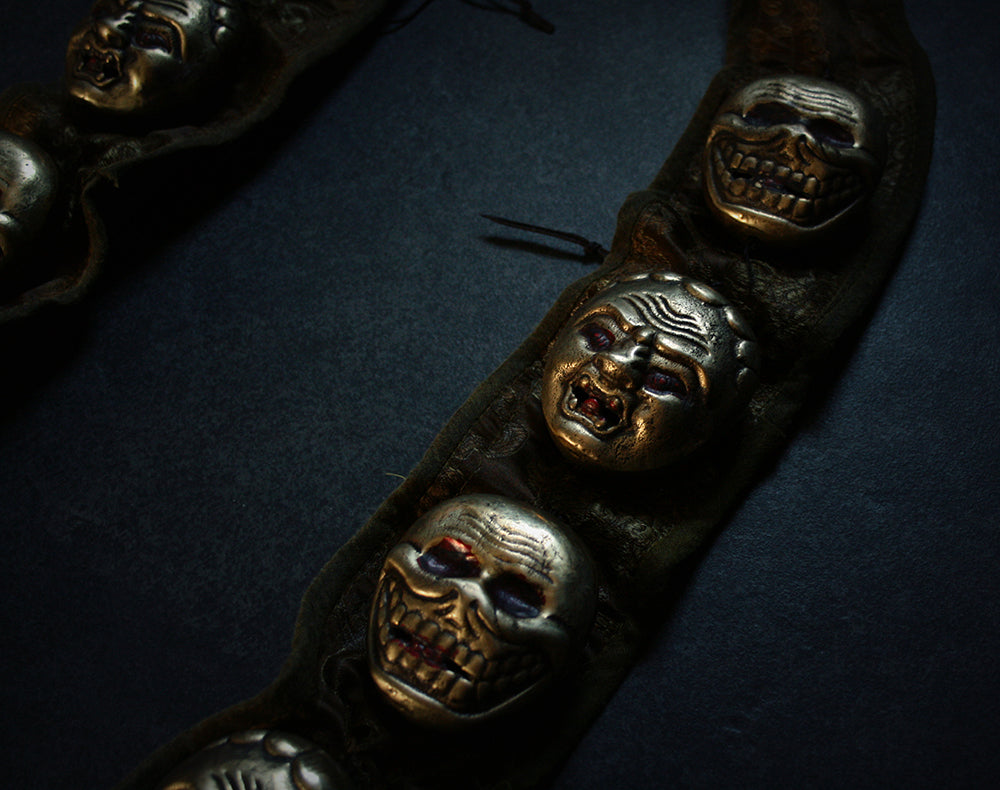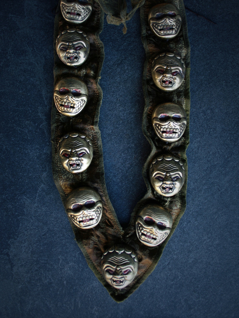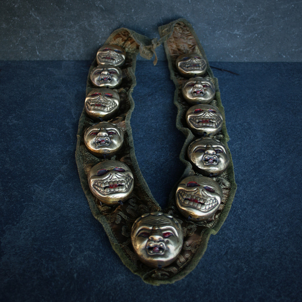 This is a buddhist ritual objects - Citipati and Makahala charm necklace. This is a very heavy and highly unique and exclusive item. This can be worn or hang above the altar. Each skull / face is a heavy brass sculpture.