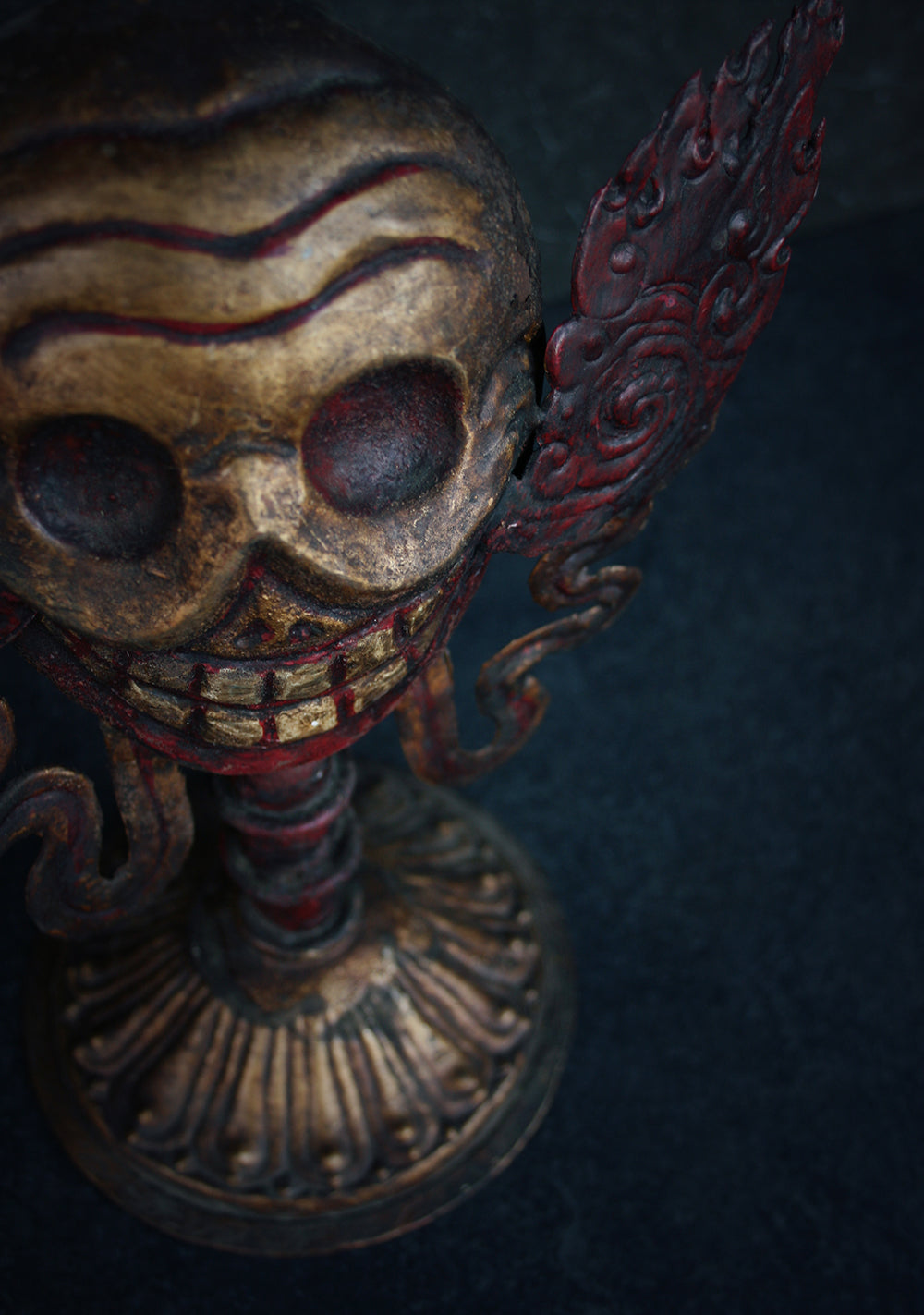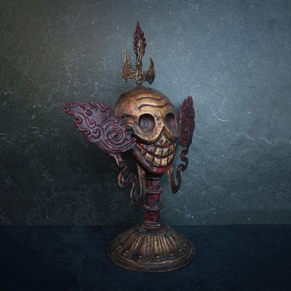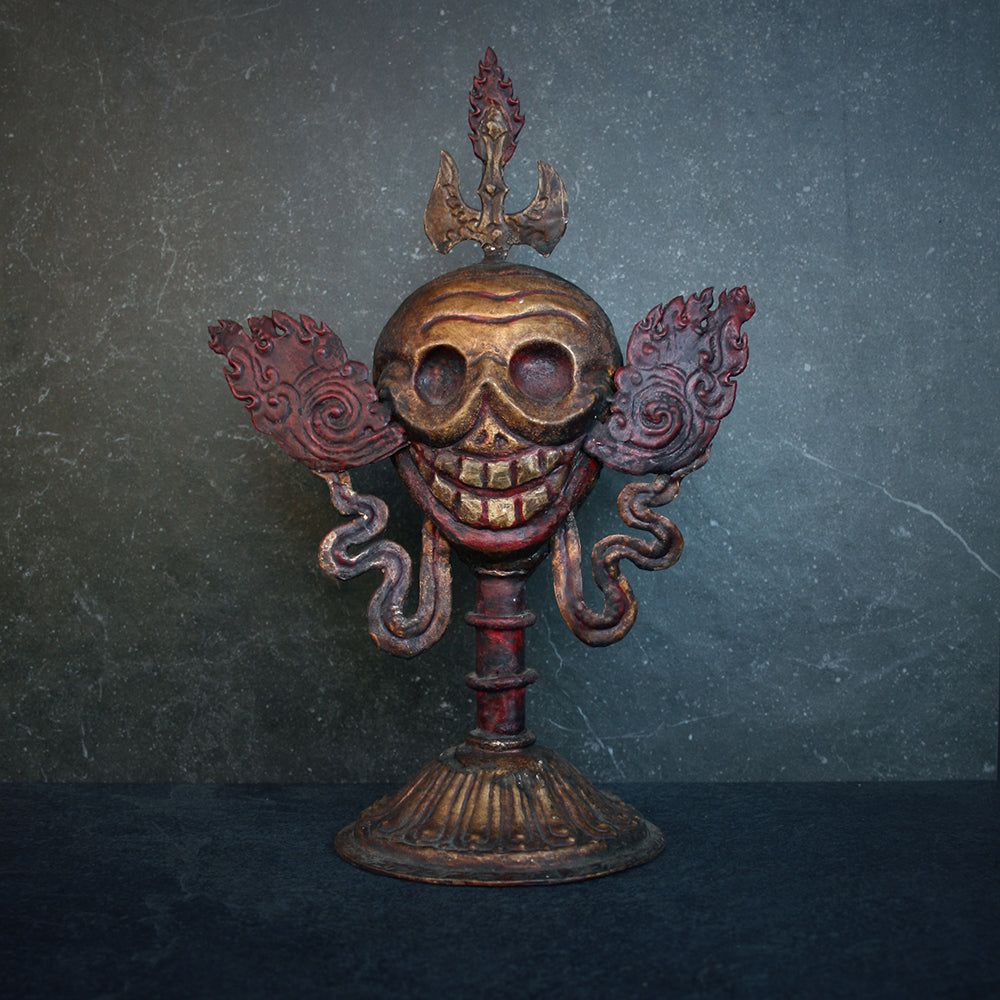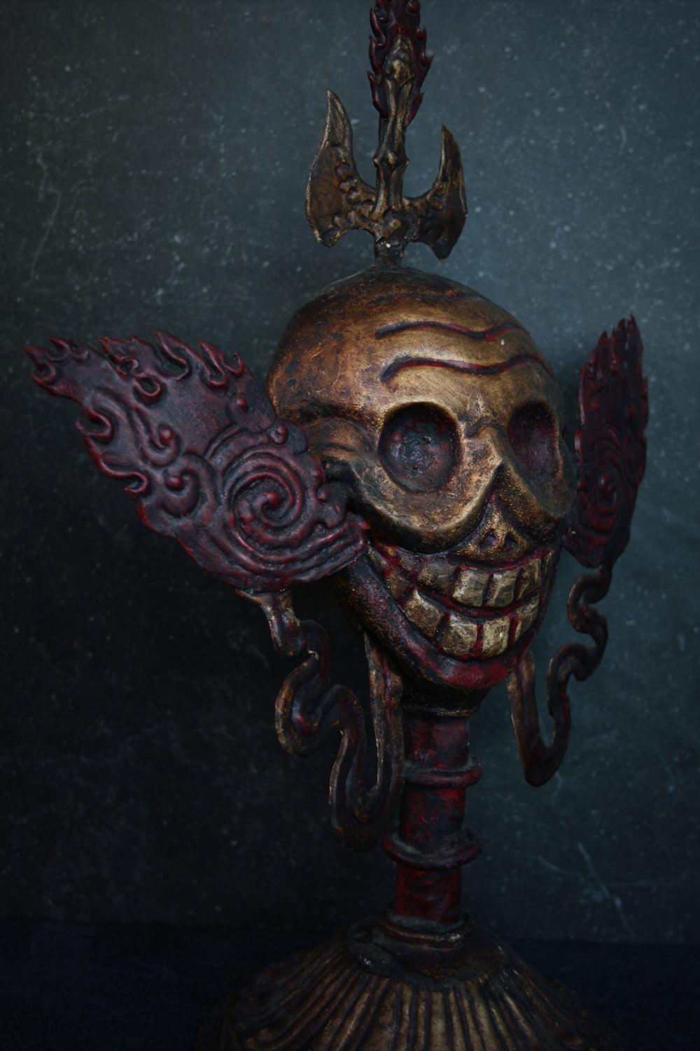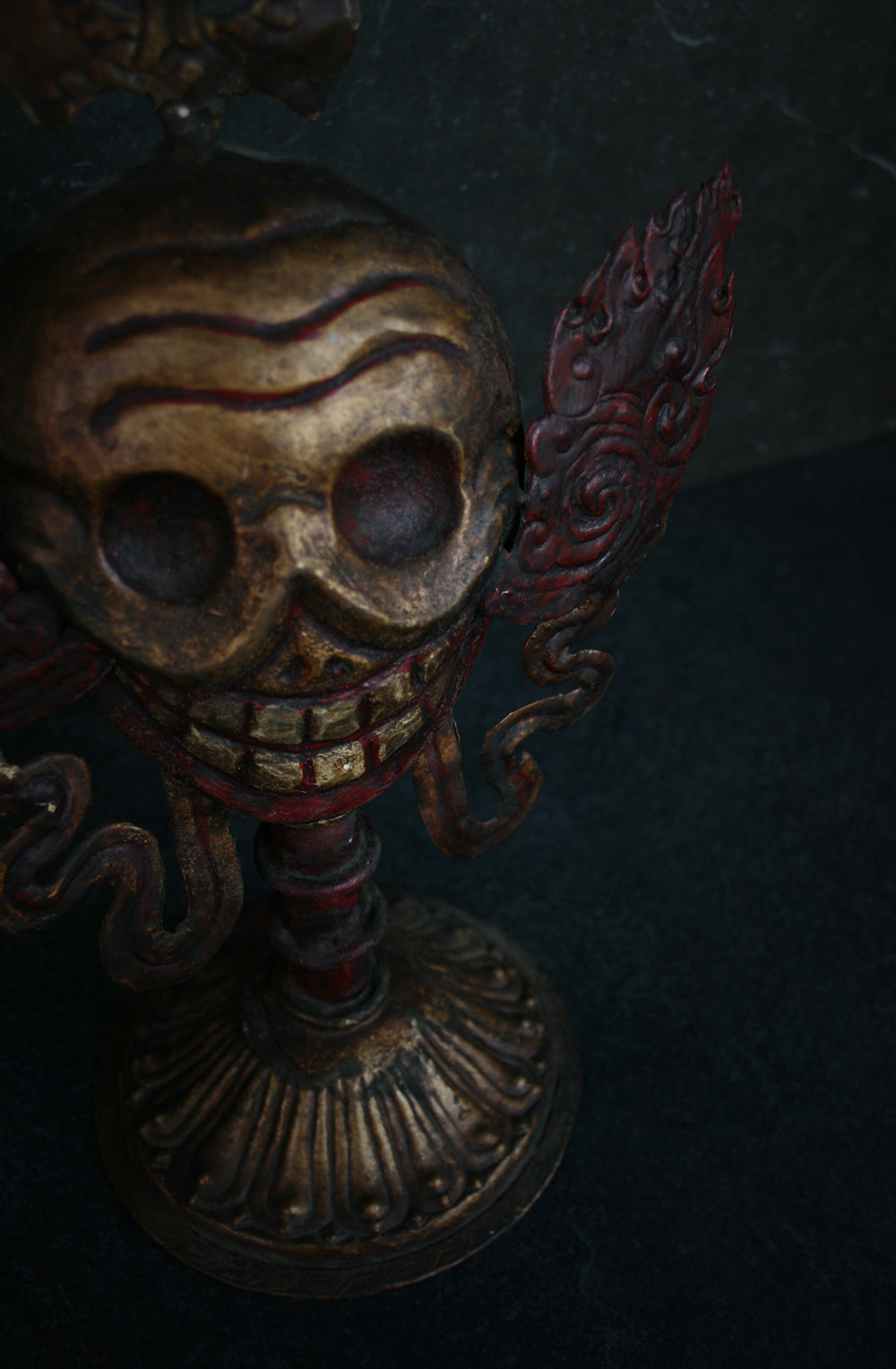 Tibetan skull with flames, Citipati, COPPER stand - RITUAL ITEM